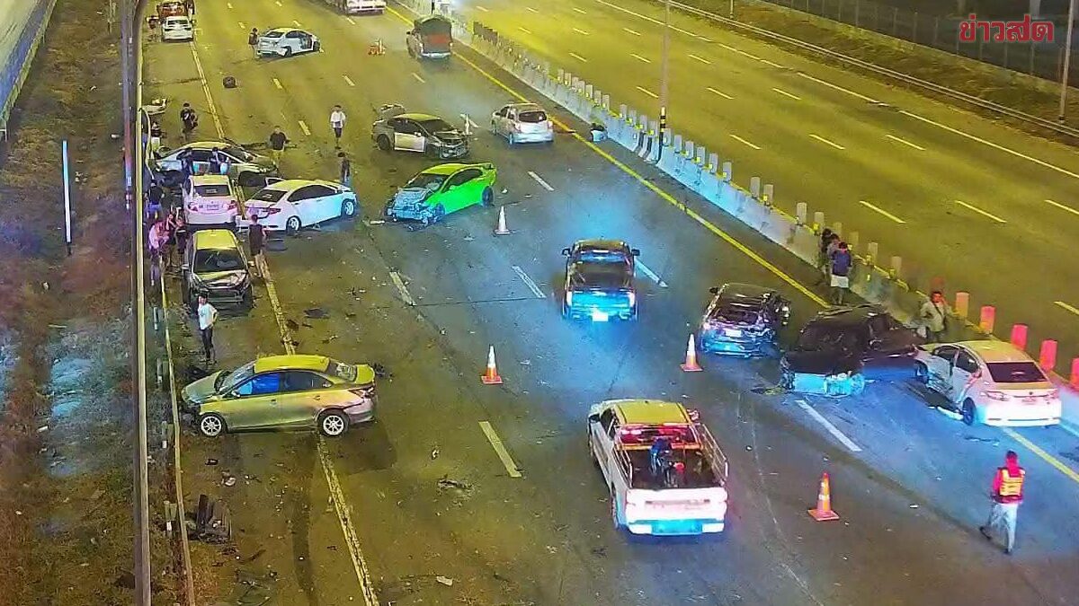 แก๊งรถเก๋งซิ่ง พังยกตี้ แข่งกันมาบนมอเตอร์เวย์ ชลบุรี ชนระเนระนาด 12 คัน กู้ภัยคาดอาจมีคนเมา เจ้าหน้าที่ตำรวจเร่งสอบปากคำผู้ร่วมเหตุการณ์