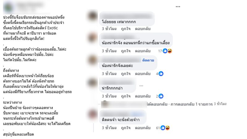 โดยเจ้าของโพสต์ระบุข้อความว่า “ช่วงนี้รับจ็อบขับรถส่งของผ่านแอพฯหนึ่ง ซึ่งครั้งนี้ คนเรียกรถเป็นลูกค้าเจ้าประจำที่เคยใช้บริการให้รับส่งสัตว์ Exotic ที่ผ่านมาก็จะมี คาปิบารา, มาร์มอต แต่ครั้งนี้ให้ไปรับลูกสิงโต!”
