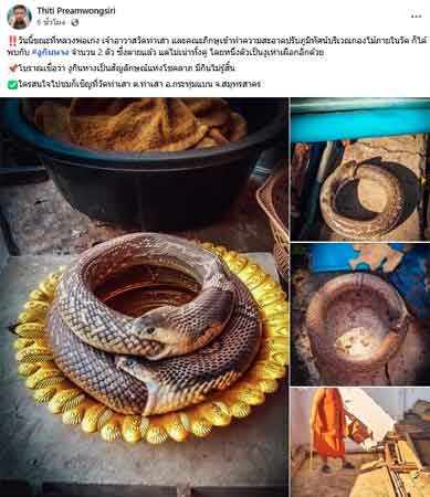 โดยหนึ่งตัวเป็นงูเห่าเผือกอีกด้วย โบราณเชื่อว่า งูกินหางเป็นสัญลักษณ์แห่งโชคลาภ มีกินไม่รู้สิ้น ใครสนใจไปชมก็เชิญที่วัดท่าเสา ต.ท่าเสา อ.กระทุ่มแบน จ.สมุทรสาคร” โดยหลังจากที่โพสต์ดังกล่าวถูกเผยแพร่ มีผู้คนจำนวนมากเข้ามาแชร์ต่อ