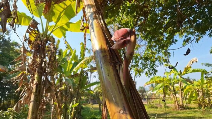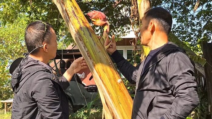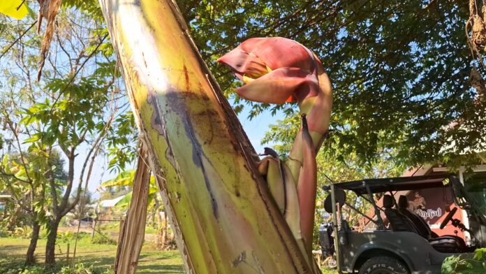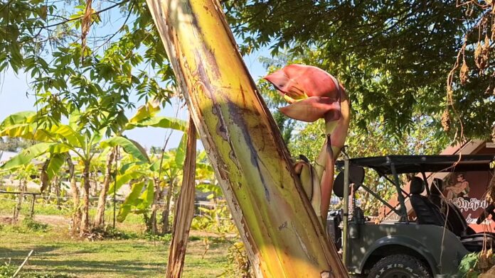 ผู้สื่อข่าวเดินทางไปที่ หมู่ 13 ต.แม่นาเรือ อ.เมือง จ.พะเยา พบมีชาวบ้านต่างพากันมาดูปลีกล้วยประหลาด โผล่มากลางลำต้น ที่ทางนายวิภูศิลป์ นนท์ศรี เจ้าของสวนตูบศิลป์ ปลูกไว้ภายในสวนมากกว่า 20 ต้น