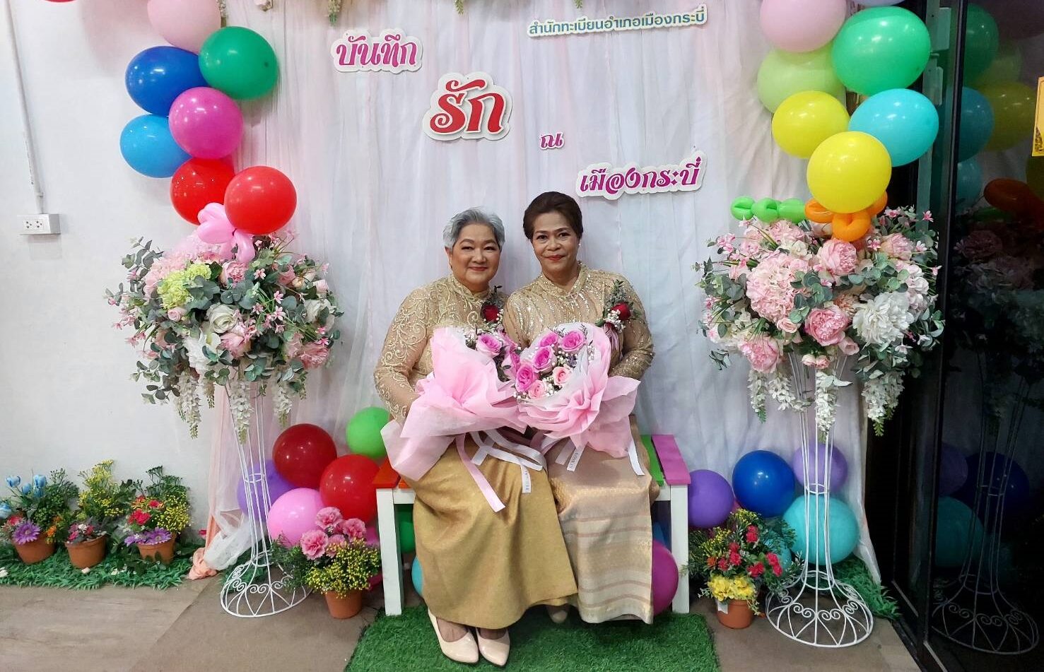 กระบี่ สาวหล่อรุ่นใหญ่ 63 ปี ควงคู่รักแฟนสาว 58 ปี ขึ้นที่ว่าการอำเภอเมือง จดทะเบียนสมรสเท่าเทียม คู่แรก หลังใช้ชีวิตอยู่กินร่วมกันนาน 23 ปี พรรคพวกเพื่อนฝูงญาติๆ ร่วมยินดีคับคั่ง